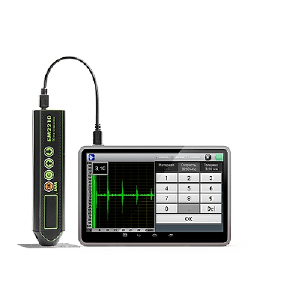 Подключение планшета, смартфона или другого устройства на базе ОС Android, позволяет расширить возможности толщиномера EM 2210 до уровня современного дефектоскопа, с возможностью отображения и сохранения А-скана, B-скана, возможностью работать со стробами, выбирать режим измерения толщины, параметры обработки сигнала и т.д.