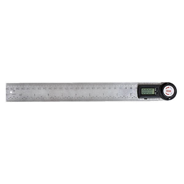 Компактные размеры и возможность измерения углов до 360° позволяют использовать угломер при монтаже полок, окон и других бытовых работах. К тому же, угломер удобно хранить и транспортировать в ходе работ. Основные части прибора изготовлены из нержавеющей стали, благодаря чему обеспечивается долгий срок работы цифрового угломера RGK A-30. Угломер вы можете использовать и в качестве стандартной линейки, за счет конструкции из 2 раздвижных плоских частей со шкалами в см и дюймах. С помощью специальной регулирующей ручки вы можете зафиксировать измерения под любым углом, что позволяет использовать прибор качестве угольника, а также переносить результаты измерения в чертежи.
