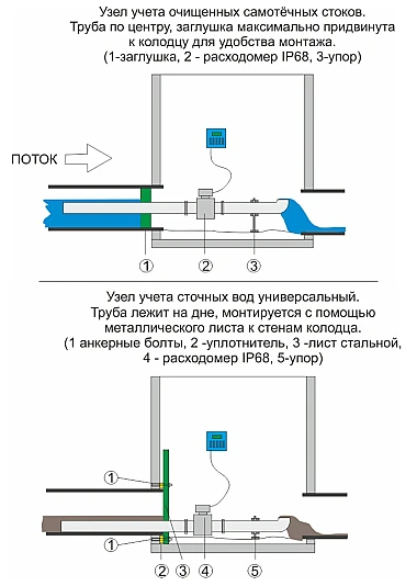 Если сужение допустимо, то расходомерный участок может быть установлен по центру либо по низу входящей трубы. Герметизация производится с помощью механической заглушки внутри трубы (при установке по центру), либо металлическим листом к стенам колодца.