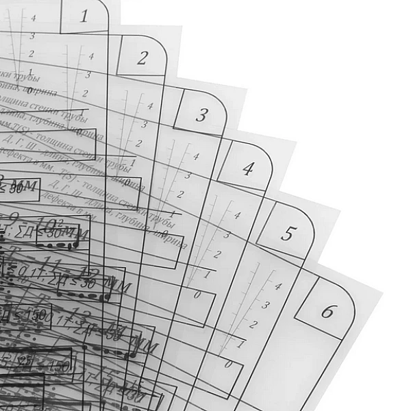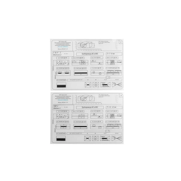 УШР-4 состоит из 11 шаблонов в виде прозрачной пленки размером 297×210 мм с нанесенными схематичными изображениями нормативных отрезков сварного шва и дефектов всех типов, предусмотренных ГОСТ 7512–82. Каждый предназначен для определенной толщины стенки* трубопровода: